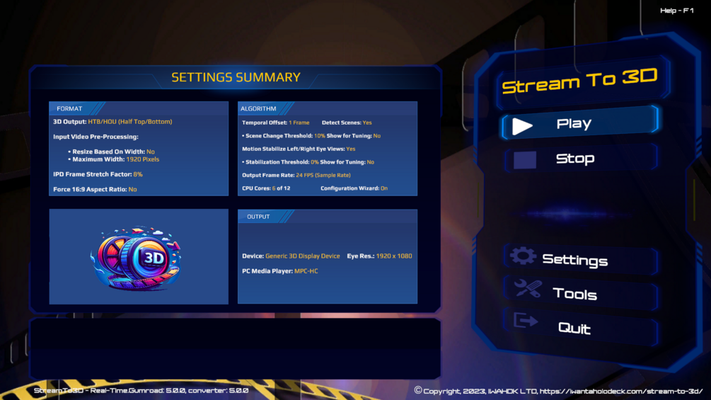 Stream to 3D - Real-Time is designed to support the fully automatic on-the-fly conversion of 2D videos to 3D, as they are played. Includes 1 week introductory free trial (one trial period per customer). Version 5 introduces real-time live video camera and PC screen capture conversion, enhancing your capability to produce dynamic, real-time stereoscopic 3D content effortlessly. For the addition of the ability to save or stream the converted video file, see our sister products Stream to 3D - Complete or Stream to 3D - Standalone.